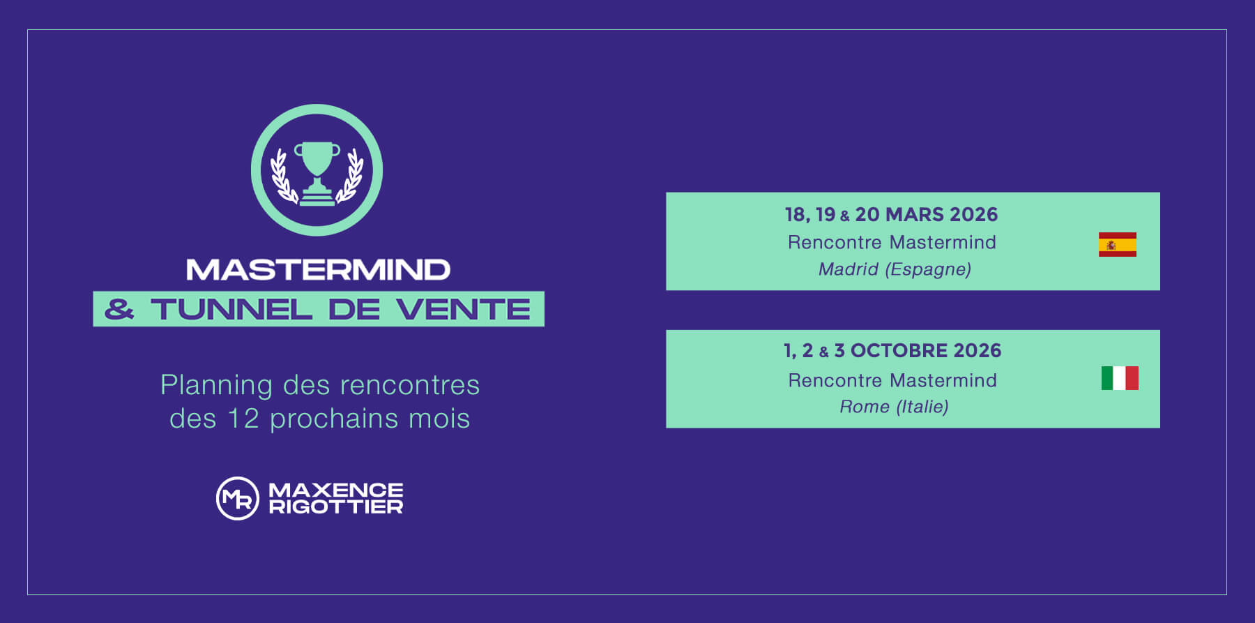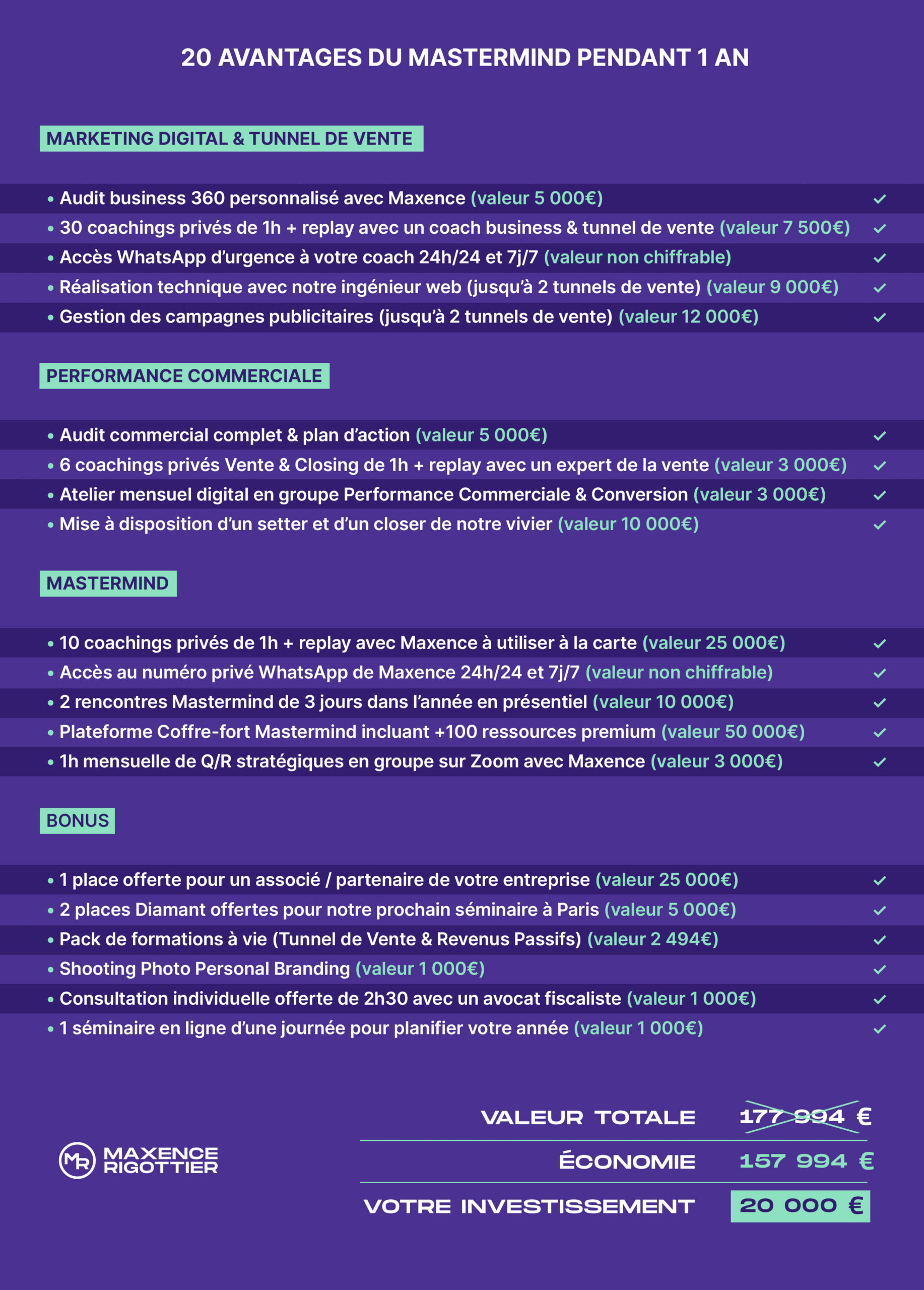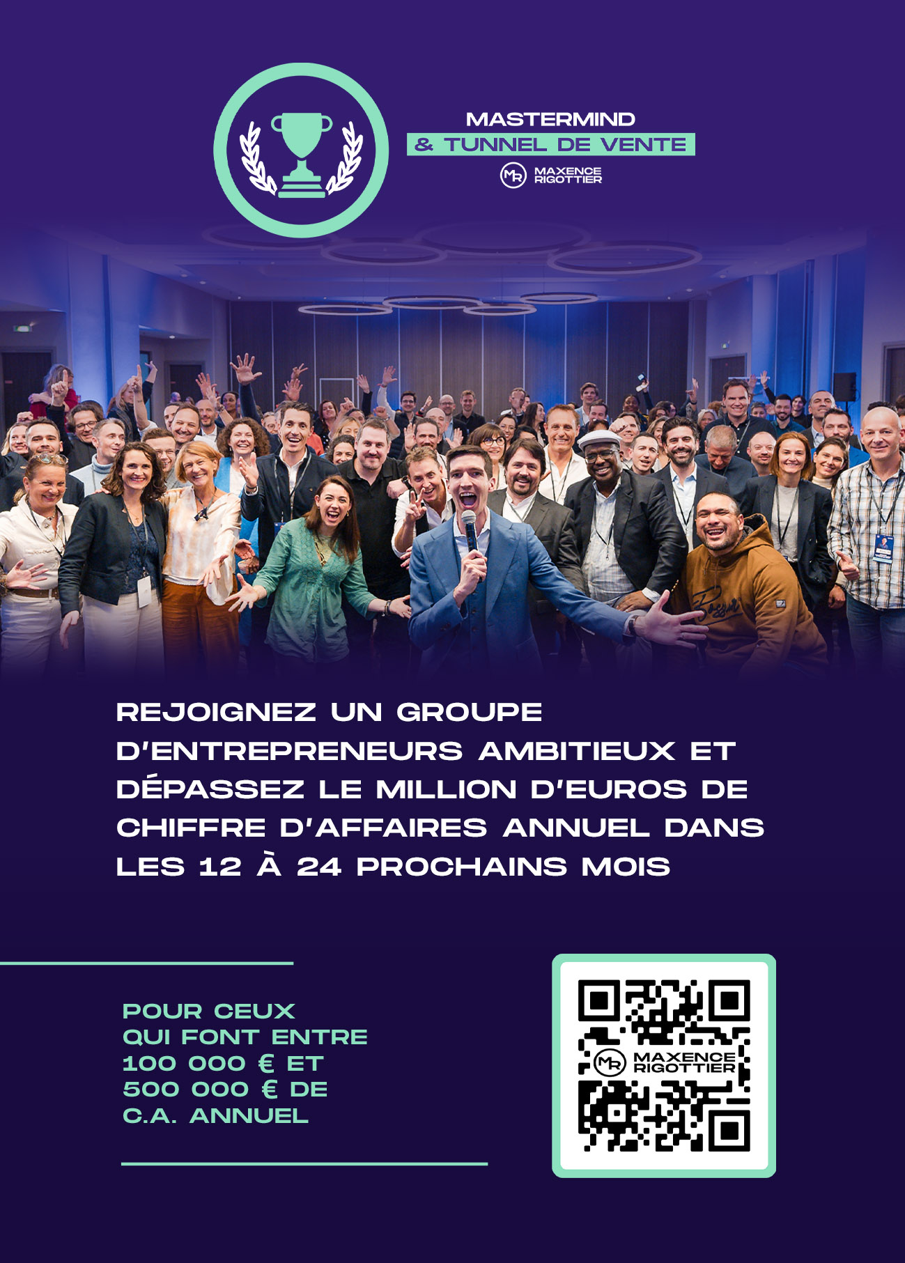 Le Mastermind & Tunnel de Vente offre une expérience d’accompagnement unique qui combine Maxence en mentor, les sessions de coaching individuel avec l’un de ses coachs business, le cerveau collectif pendant les rencontres Mastermind et le contenu dédié aux entrepreneurs afin de structurer leur entreprise et dépasser le million d’euros de chiffre d’affaires annuel.